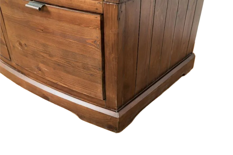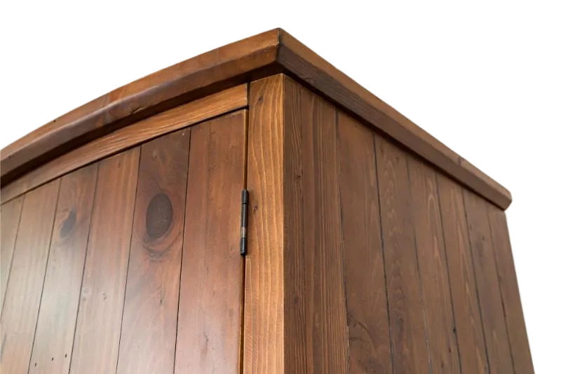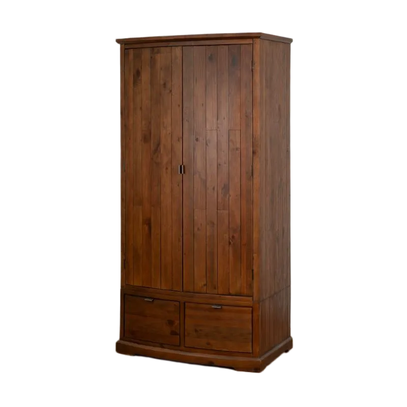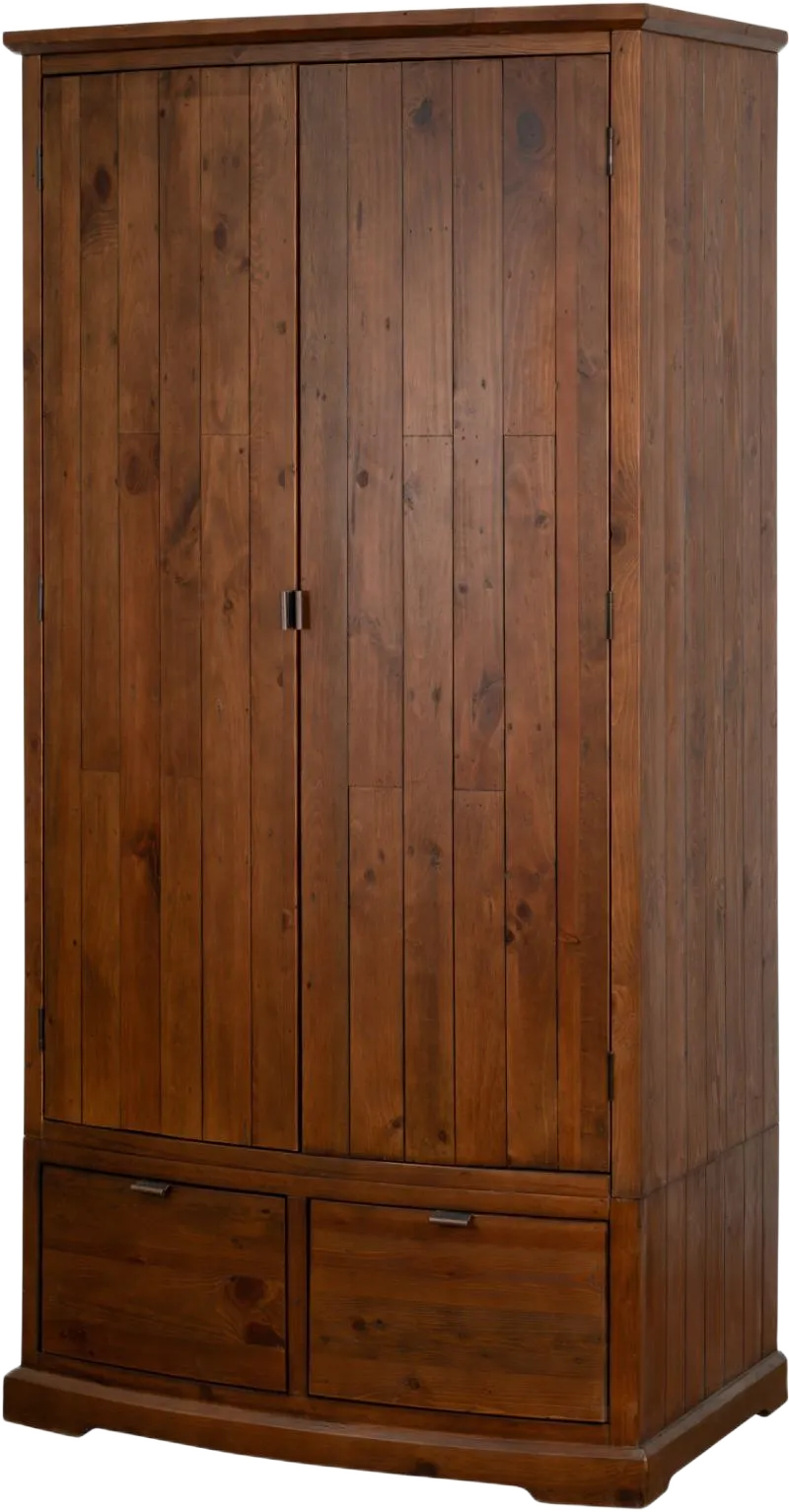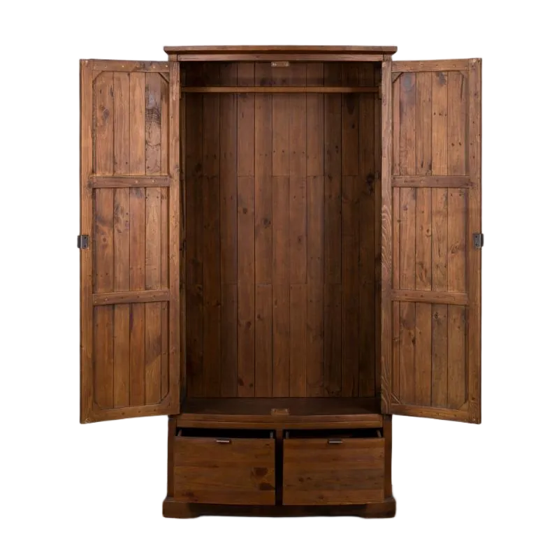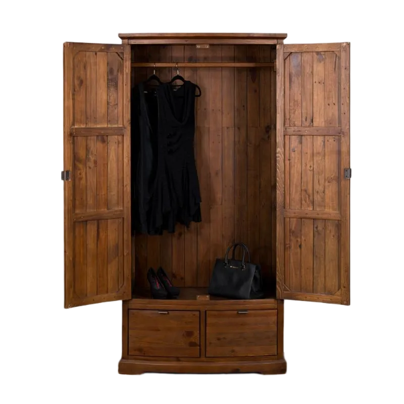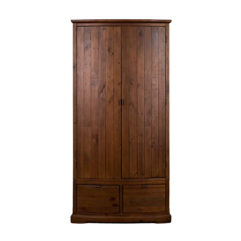 Spacious, sculptural and rich in natural character, the Boho 2 Door 2 Drawer Wardrobe brings calm elegance and practical storage to your bedroom. Handcrafted from solid reclaimed pine with traditional dovetailed joints and a gently curved façade, this piece is as sturdy as it is striking.