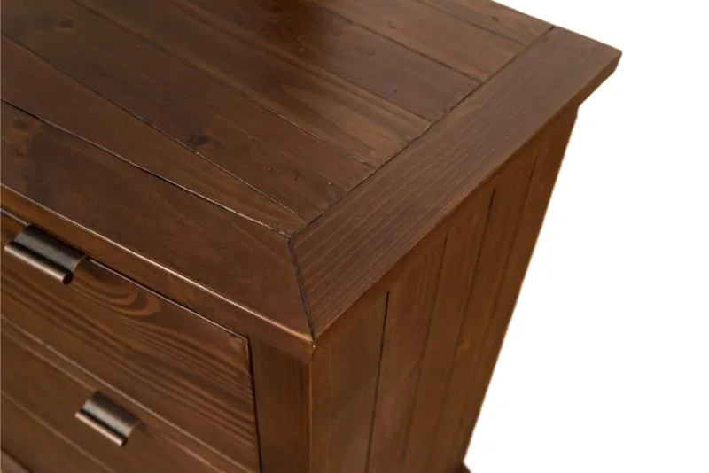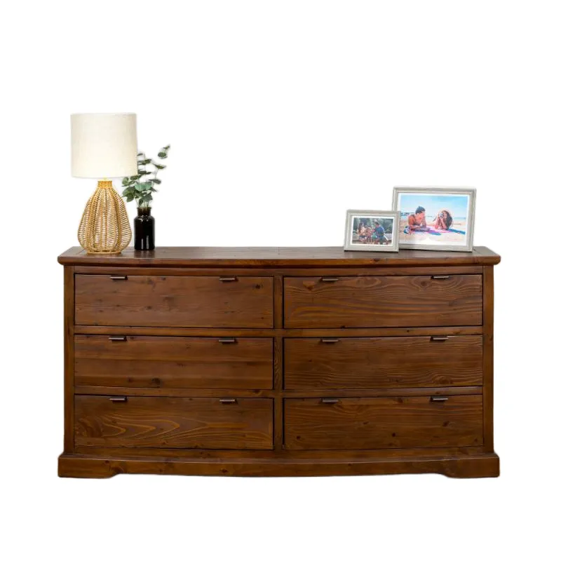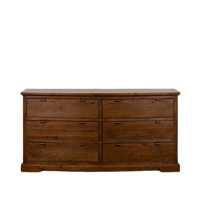 A wide, graceful statement piece crafted from solid dovetailed reclaimed pine, the Boho 3 + 3 Wide Chest blends horizontal elegance with natural character. Its gently curved front softens the bold lines, while the rich, dark lacquer finish enhances the depth and warmth of the wood.