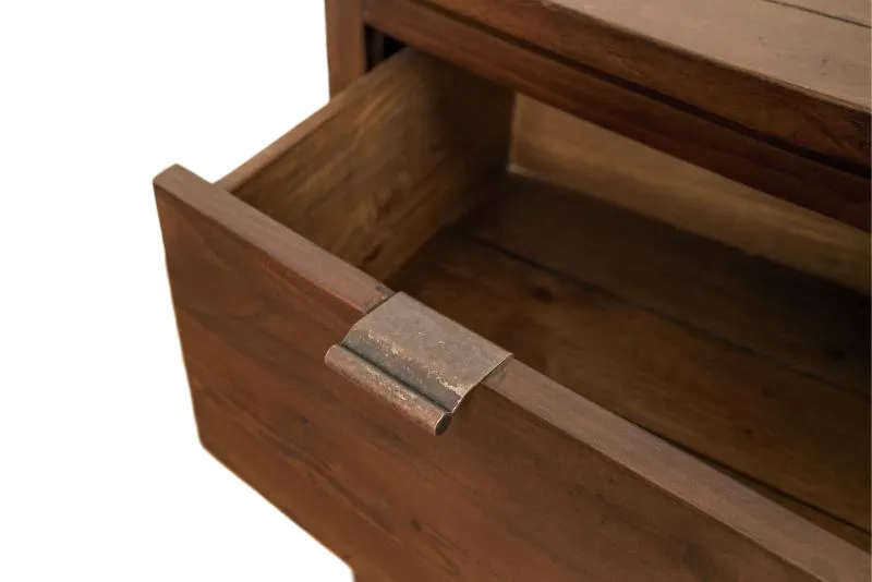 Each of the six spacious drawers is finished with antique brass rectangular handles, adding a warm, refined contrast to the rustic grain. Finished to a high standard, this timeless and functional piece brings quiet sophistication and organic charm to any space.