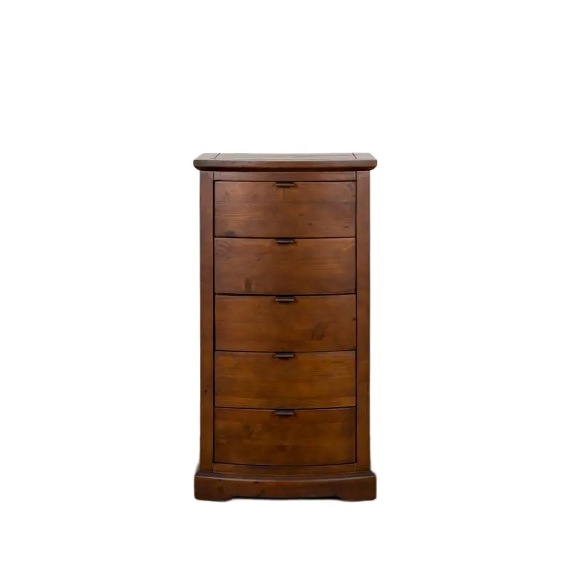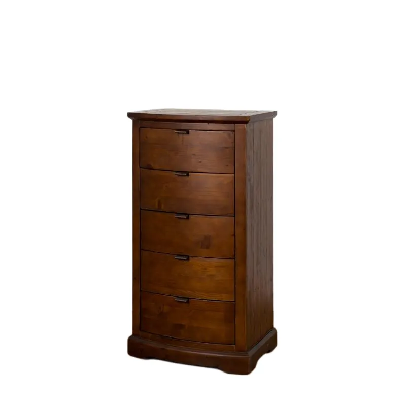 A tall, graceful statement piece crafted from solid dovetailed reclaimed pine, the Boho 5 Drawer Wellington Chest blends vertical elegance with natural character. Its gently curved front softens the bold lines, while the rich, dark lacquer finish enhances the depth and warmth of the wood.