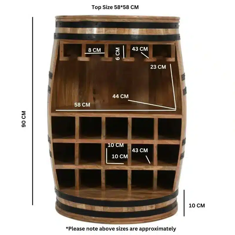 An unusual but versatile sideboard, it is cleverly designed to have the rustic charm of a wine barrel it has loads of space for wine bottles, glasses, and other accessories, making it a practical choice for wine lovers or anyone looking for extra storage space when entertaining, and the finish is expertly applied to ensure durability, making it resistant to stains and easy to clean, so you can enjoy your sideboard without worrying about maintenance.