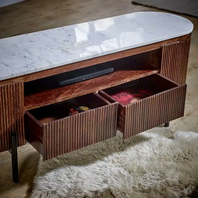 The Slattio Solid Mango Hardwood Wide 2 Drawer Media Cabinet is crafted with meticulous attention to detail, seamlessly blending functionality with breathtaking beauty.
