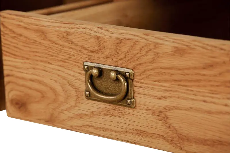 Embracing tradition, the Sofia Collection features antique-style brass-effect drop handles. These handles not only enhance the overall aesthetic of the cabinet but also evoke a sense of classic charm that complements the oak’s rich warmth beautifully. With the generously-sized drawers, this table offers versatile storage solutions for your magazines, books and coffee! It’s designed to seamlessly blend functionality with sophistication, making it an ideal addition to any room.