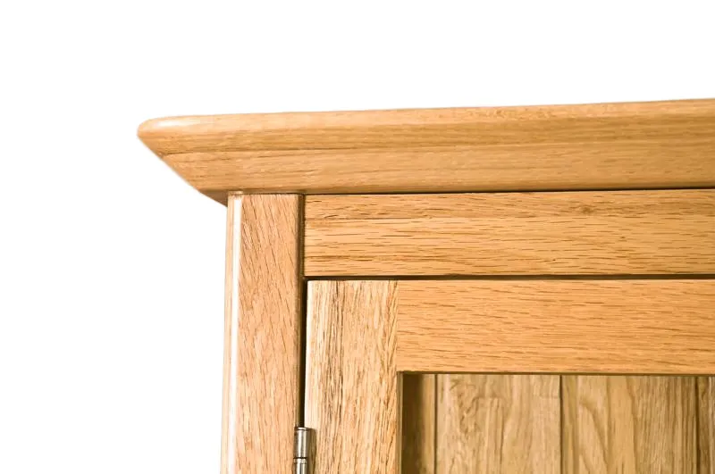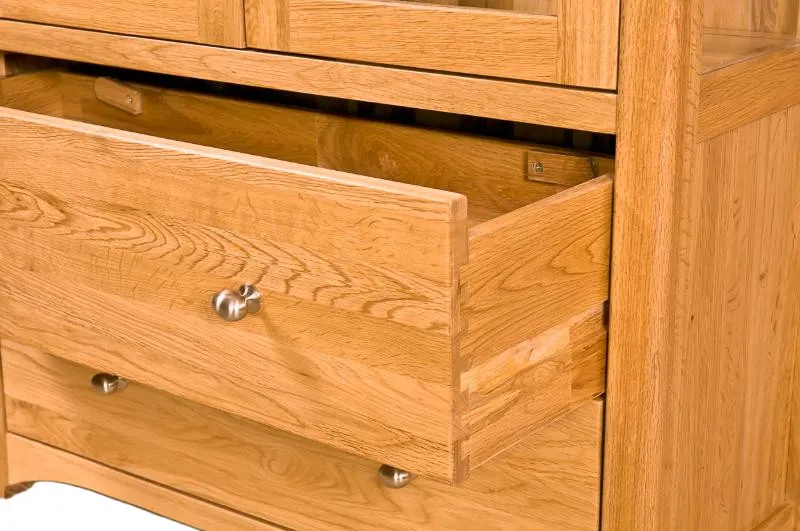 The exquisite Tocita Collection Handcrafted Solid Oak Glass Display Cabinet is crafted from the finest American solid white oak, and features two glass doors, two large lower drawers and multiple shelves for versatile organisation, with silver, tear-shaped knobs giving the furniture a modern edge. An unparalleled work of art, it is meticulously constructed with precision and care, exemplifying the enduring strength and beauty of dovetail joinery to ensure your cabinet remains both sturdy and elegant for years to come. The hand-applied lacquered finish infuses this display cabinet with an inviting warmth that beckons you to gather around. This thoughtful finish subtly accentuates the natural grain of the oak, imbuing every piece with a unique and individual character that adds a touch of rustic charm to your home.