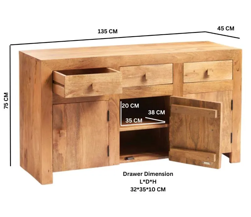 The sideboard features three side drawers three lower doors to a spacious area providing ample storage space for your belongings. Each drawer is carefully constructed with traditional dovetailed joints, ensuring durability and longevity. The solid chunky hardwood handles add a touch of sophistication, perfectly complementing the overall design.